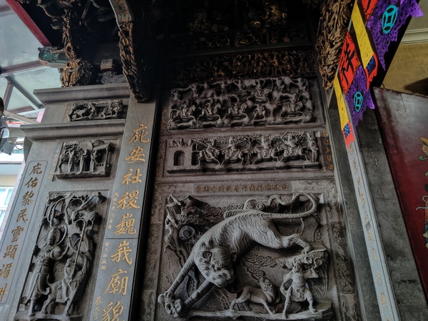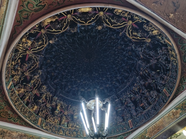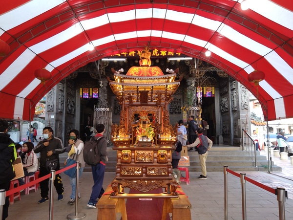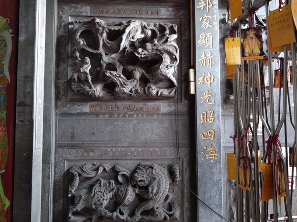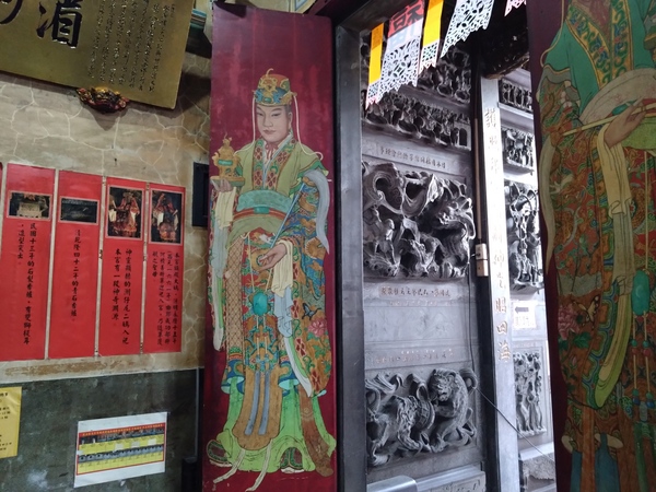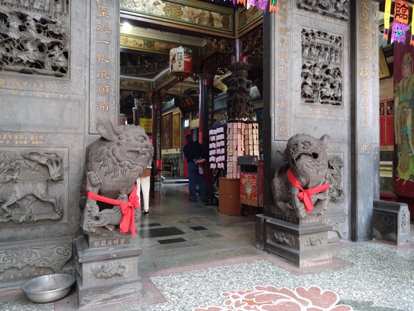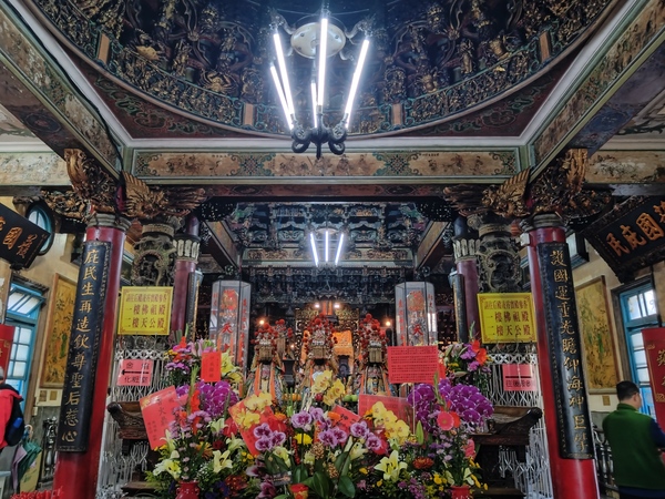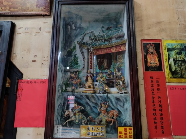 主祀天上聖母的正殿天花板,「水族藻井」是為了避免火災所設計,鑿刻人物塑像之外,匠師更增添螃蟹和龍蝦雕飾,彷彿一座可以壓制祝融的水族世界;至於「托金獅奪帥」剪黏作品則隱藏在服務櫃檯後方,據說,唐太宗李世民曾經主辦石獅舉重競賽,最後由年紀較輕的尉遲恭勝出,順利從秦叔寶手中接下總兵大元帥職位。