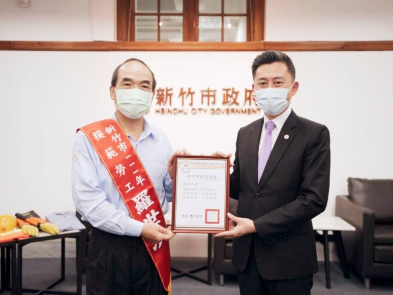 勞動節前夕,新竹市長林智堅接見表揚竹市模範勞工-台電新竹區營運處主任羅世洪。他已入行41年,除專業工作表現,更充滿熱心與愛心,曾於檢查用電安全時,發現獨居老人屋內電源短路造成無電多日,自掏腰包購買材料更換,也在節電宣導活動主動捐款幫助生活清苦的身障獨居長者。林智堅市長表示,今(111)年有214位模範勞工,感謝大家奉獻付出,市府團隊將持續努力,成為勞工朋友最堅強的後盾。