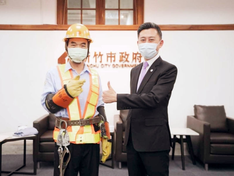 台電新竹區處調度組配電調度中心主任羅世洪,今(111)年獲選竹市模範勞工,65歲的他入行已41年,平日工作內容包含用配電調度值班、用電安全檢查及用電技術服務等。他說,年輕時在苗栗服務,可說爬過所有苗栗的電線桿,他也親自向林智堅市長重現當年外勤工作的「安全穿搭」,包括棉質制服、安全帽、手套、腰帶工具、反光背心等。