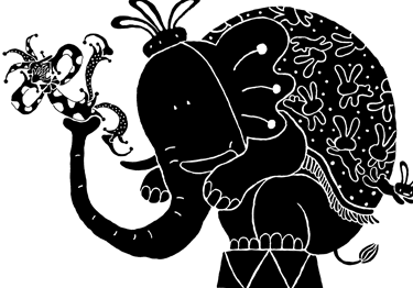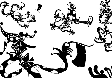 這本書以小丑的出場展開序幕,一開場就吸引了讀者的眼光與興趣,因為這位小丑的造形誇張得妙極了,他有著好長的鼻子、好大的嘴,以及不成比例的長手和長腳,加上豐富的表情、多樣的肢體動作,很生動的把小丑的百態呈現了出來。之後出現的兔子、大象、獅子、大熊和馬兒等等動物的造形,也都描繪得很討喜突出。更難得的是,在看似單調的黑白對比圖畫中,利用圓點與線條的多樣變化,展現出了極為豐富的裝飾之美的畫面效果來。