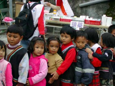 住在偏遠山區的兒童,無法享有隨時就醫的機會,所以當得知義診團到訪,就由老師帶隊集體前往看診,可見醫療缺乏對他們的影響有多大。一群坐著娃娃車前來檢查牙齒的兒童,讓「中平」部落的午後充滿了笑聲。當孩子們排好隊伍,一個個緊貼著身體,並在義工們的鼓舞下唱起一條接一條的兒歌(妹妹背著無敵鐵金剛,走到花園來看葉子媚……),山地孩子的嘹喨歌喉在此展現無遺,並吸引了許多義工們上前合影留念。此外,當地的勞工、婦女,還有年邁的老人,也都不願錯過這個「有病看病、沒病領營養品」的機會,幾乎是動員全社區前來看診,讓我感受到路竹會長年扎根的成果,才會讓社區居民個個趨之若鶩。