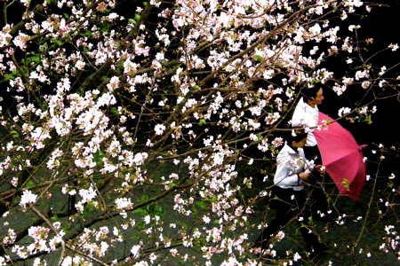 狂風夾著細雨打落片片櫻花瓣,如柳絮因風而起的飛散,如初雪飄落大地的輕柔。賞花的人們啊!滿身都是依戀的花瓣,這美,不只美在身上,更美進了心裡!