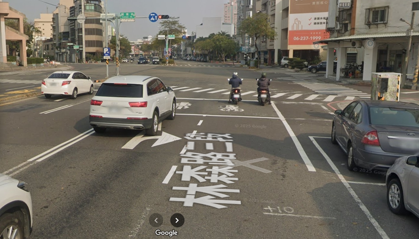 二月帶著女兒調來台南,對於東區林森路附近道路標誌標線設計有點困惑,道路最右邊是收費停車格,第二線是機慢車優先道,第三線是汽車道,汽車除非右轉或要停車,不得靠右行駛於機慢車優先道;但當汽車駕駛人不敢隨便行駛在優先道上,特別是從外縣市或是外國來的遊客,將導致汽車右轉時,直接從中間車道右轉,直行機慢車此時就可能衝撞上汽車,而且中間車道上還有直行與右轉合併指向標線。