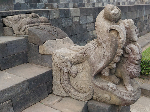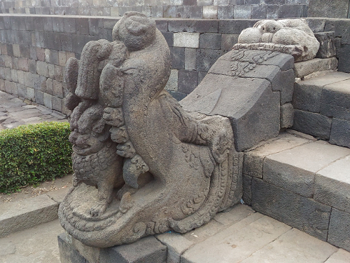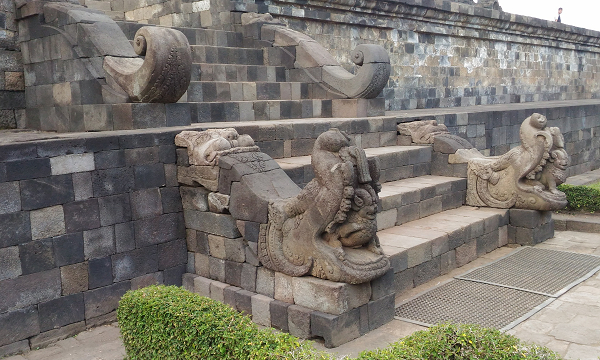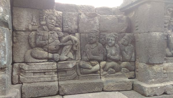 共有4個這樣雕刻的入口,原本的古蹟因為火山噴發和地震,全都散落在地上,是聯合國的人花錢,請專家和工匠為每個石頭編號,一顆一顆再堆起來的,所以有些地方堆得怪怪的,可能找不到原蹟,做個新的填上,但整座佛廟真的很壯觀。售票處,提供過膝的長裙,給穿短褲服裝不夠端莊的男女遊客借用,這種情況在緬甸參觀佛塔也有過,所以要到東南亞或中東旅遊的客人,還是穿過膝的褲子或裙子較適合,萬一遇到要進清真寺或佛寺,就不用租借長裙了。