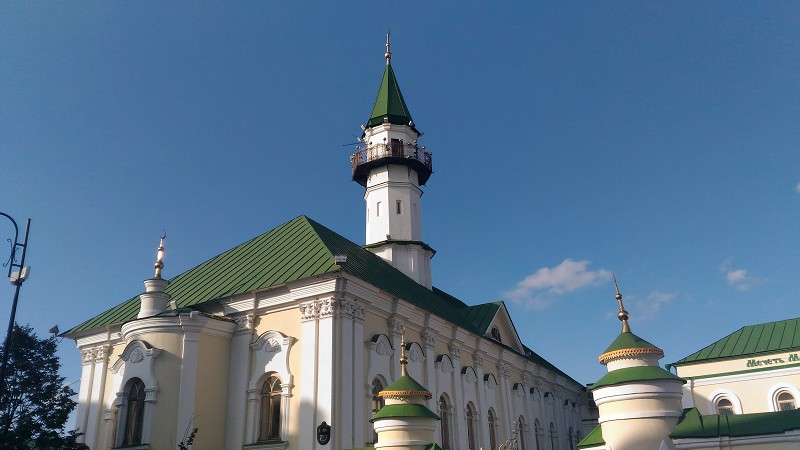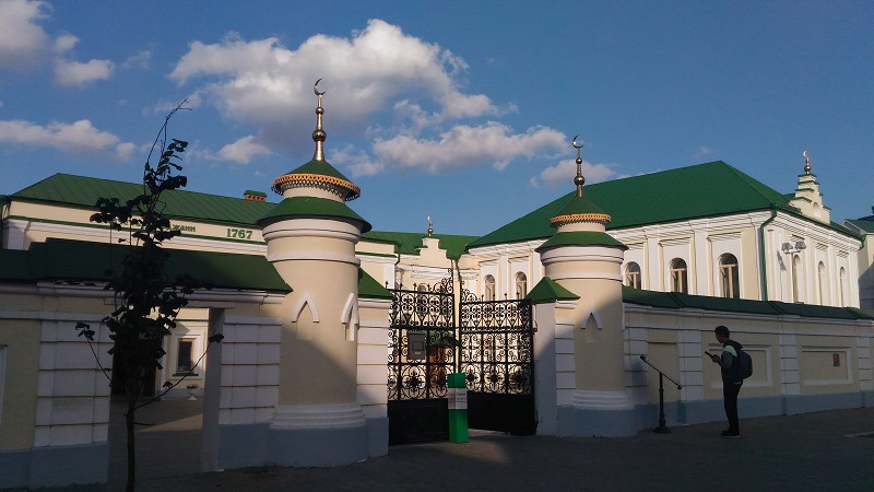 綠色是穆斯林的顏色,他們的清真寺頂部也是漆成綠色的,喀山的舊城區,有個蓋了一間200多年的教堂,是伊凡四世攻陷韃靼,燒毁教堂後就不準蓋了,直到凱薩琳大帝在位(18世紀山),才得以準許他們重建穆斯林教堂,就是這有名的馬兒卡尼清真寺,當時仍有人向凱薩琳大帝反應不可允蓋,結果凱薩琳大帝回應說,"我只管人間的事,這種天上的事,不歸我管。" 真是一位有智慧的好女皇。