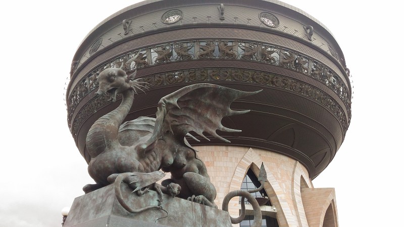 喀山在當地語的意思是"大鍋",所以在伏爾加河的另一邊河岸,屬於新區,蓋了一個大鍋的象徵建築物,底下的支撐處是婚姻登記所,每對喀山要結婚的市民一定要來這報到,在鍋的四周,有4條吉祥龍守護著,這種喀山龍與中國龍,還真有點像呢