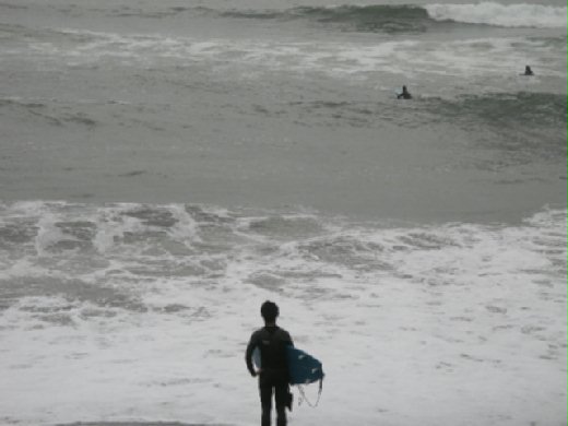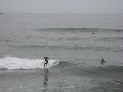 我想,我就是喜歡湘南的海散發著的這股虛幻氣息吧。在宛如玻璃的大海上,也總會看見一些小黑點。那是衝浪的人們坐在滑浪板上,靜待心目中完美的浪濤捲 起。由於是初夏季節,衝浪的人不多,從遠處看,但見一排幾個小小的黑點,以靜止的姿態浮沉於浪濤之中。那些身影看上去都好孤寂,好像隨時會被灰色的世界吞沒一樣。特別是在下著霧雨或大雨的日子,在暗昏的天空下,望著那些小小的人兒,總讓我覺得很感動。
