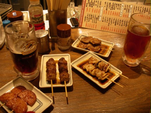 店內的串燒十多元港幣有兩串,便宜得令人吃驚,還有不同種類的啤酒和燒酎。先點叫啤酒,吃了一輪炭燒肉串,再續點燒酎,伴炸肉串燒,吃得肚子好撐好撐。聽日本人說,站著喝酒不會那麼容易醉,於是大家更歡歡喜喜地今朝有酒今朝醉了。