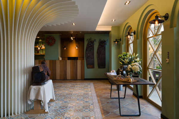 走入大廳,感受到南方風情強烈的鄉村色彩,以歐式拱門開啟旅程,綠色牆面做為空間背景,結合木頭、石材、地面復古磚與花磚,展現細膩的俐落線條交織出美學層次;沙發區以造型柱體象徵生命之樹,映照出綠意盎然的自然氣息,立面則以粗獷的耐火磚結合櫃體,做為場域的內外界定。
