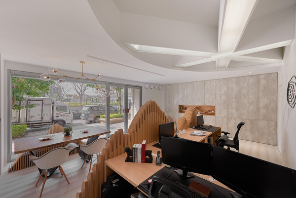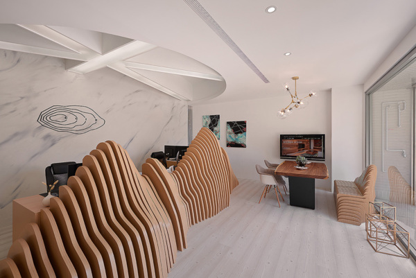 The artistic figuration of mountain signifies not only the visual perception to the company, but also the passion to the design. The installation art figuratively mimics the undulating structure of mountain, which symbolizes the down-to-earth design professions and spirits of the company. The excellent craftsmanship constitutes an eye-catching design work in the office.