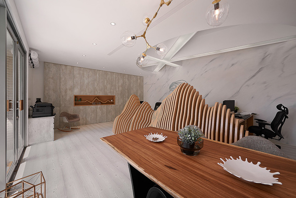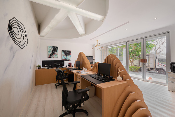 The multiple curved boards, distinctive in sizes and shapes, installed sequentially that establishes the wavy structure simulating the natural configuration of mountains. The mountain-like design work furnished between the working reception area creatively divides these two spaces. In addition to exhibiting the glamourous sense of sight, the massive walls composed of the carrara marbles is accorded to the art of Feng Shui as well. That the light-color wooden floors associated with the installation art and the wooden embellishment signifying the company name, CCID, consistently shows the identity of the company.
