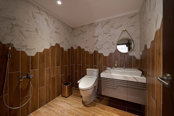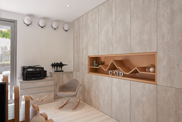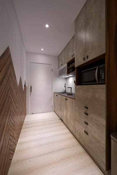 另有茶水間與洗手間雙空間背牆,也皆以原木板材直向或人字貼法做出山巒意向。如同在當代空間的理性氛圍中,憑添圖像線條與裝置等趣味視覺,在簡約處遇見北歐情懷。