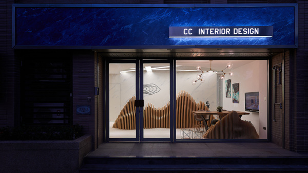 遠觀從外窗透視,看進如櫥窗裡的裝置藝術般,山巒直切片層以縱軸排列,脈絡曲韻動人。甫入大廳直視其峰,始察覺峰脈後為大桌,序列長桌可為辦公與接待用途。接待區背牆如山靠,以整牆大面積卡拉拉大理石作氣派鋪陳,既光潔如明堂,又有背靠之風水意涵。大空間中地面為淺木,牆如泥水之清水色階,輔以牆中夾櫃裡山巒曲線層板,並卡拉拉背牆上之等高線中結合了公司名之英文縮寫CCID,再再細節中皆營造出設計與主題併合理念等企業識別之相連結等呈現。