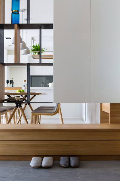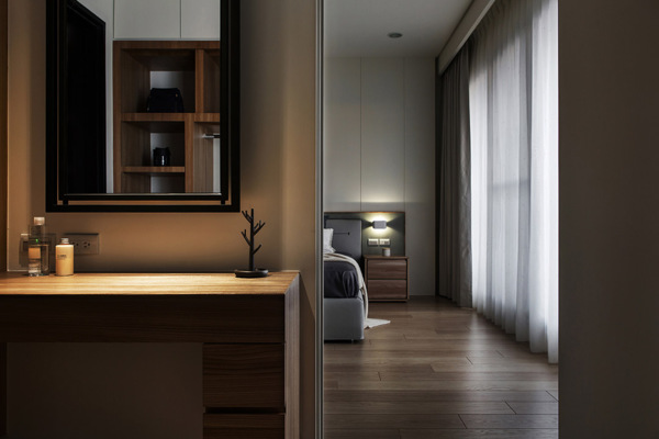 場域裡以材質顏色劃分出視覺引領感,無形中於空間裡拉出動線。地坪運用灰系石板磚配搭棕色手刮木紋,鋪陳出清新感十足的區域及過道,從迎賓玄關處一路引領至私領域臥房等,如入輕鬆之境的延伸。