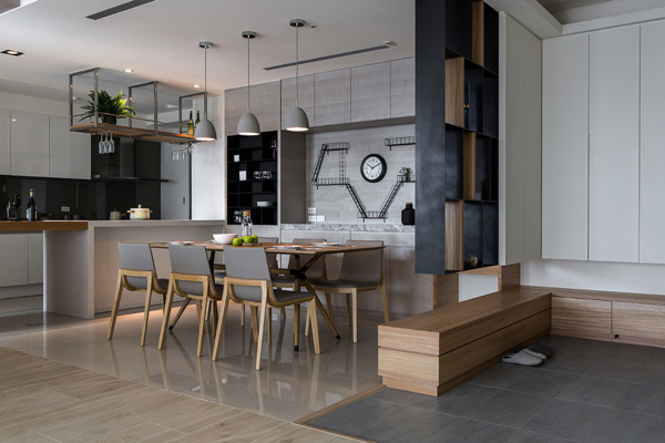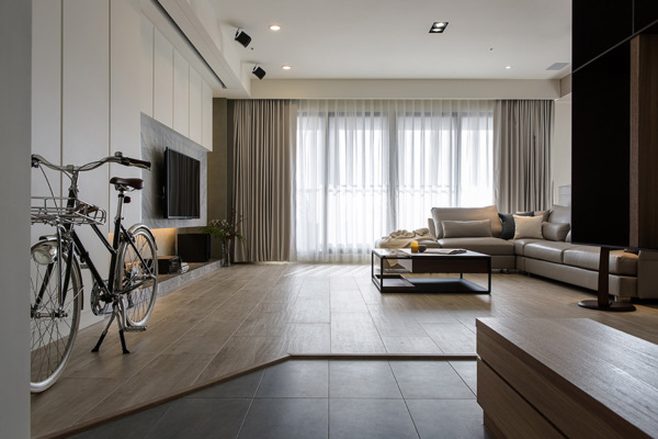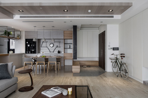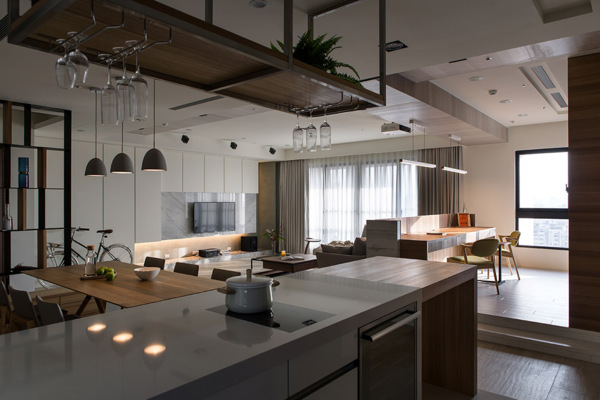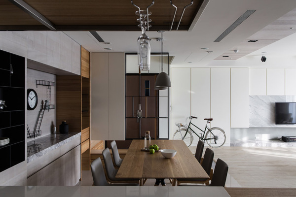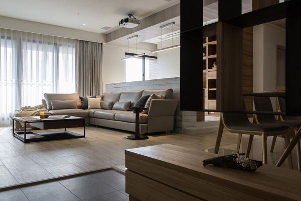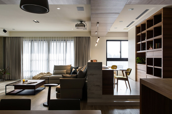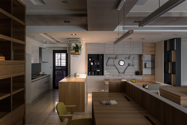 整個公領域採取大場域無隔閡的規劃,使空間在視覺與動線中如行雲流水般流暢。雙廳是通透的,父親可於客廳後架高的書房區域輕鬆直視所有範圍。母親可於廚區享烹調之樂時也能無礙的了解孩子們的活動狀況。大場域空間就如時興之所般,可隨情之所至來隨興展演生活情境,更拉近一家人共享共樂與共聚的時光。