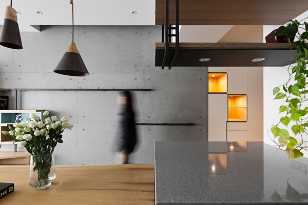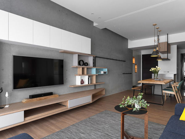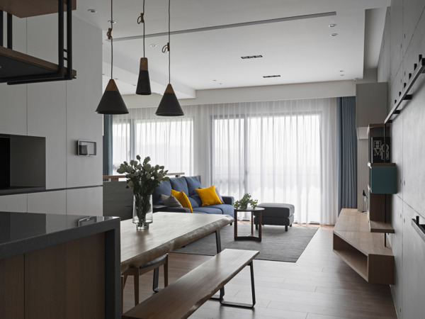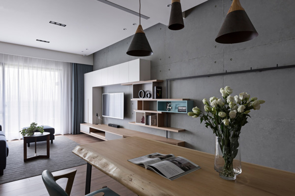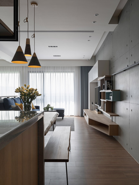 Entering from the entrance hallway, one may see the main base color tones composed of the imitated architectural concrete wall with dignified color and the warm wood texture. Continuing with the circulation to enter indoor, the public area is composed of crosswise space including the dining room and the living room. The female owner is generous and hospitable, thus the design opened up the closed and narrow kitchen to add the open yet practical kitchen semi-island and suspended cabinet, where the open space is suitable for interaction with family and friends. The droopy lighting and iron wall rack introduce a vibrating rhythm to space.