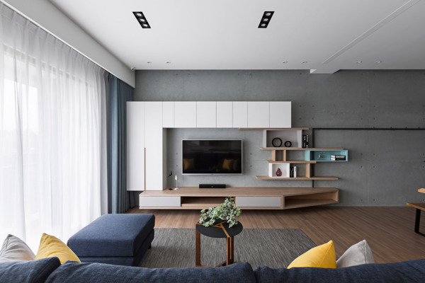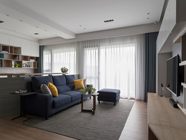 客廳電視牆捨棄一般大理石裝飾壁面,以淡出(Fade out)的設計手法來處理櫃體的設計,由完整的櫃體漸漸轉換為不規則的吊櫃或腰櫃。並以鐵件由電視櫃延伸與牆面漸進式的融為一體。靛青色的沙發成為客廳最搶眼的視覺量體,亦為空間帶來寧靜。沙發後方藉由書桌切分出開放式書房,成為重要的空間場域,書櫃亦以淡出設計使其成為客廳視覺端景。書桌走道側以斜面切割減輕壓迫感,側立面亦以斜邊的方式處理,另外佐以騰空的收邊木作增添活潑感。