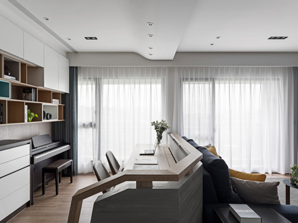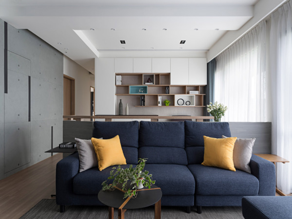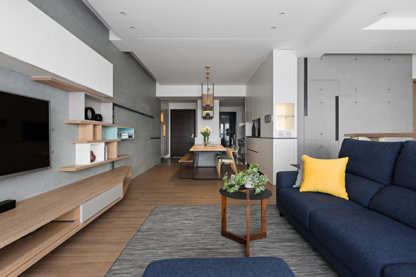 The television wall in living room discarded the common marble decorated wall, and applied the fade out design technique to handle the cabinet design, transforming gradually from complete cabinet to irregular suspended cabinet or waist height cabinet. Moreover, iron-piece is extended from the television cabinet to fuse with the wall in gradual progression. The indigo colored sofa becomes the most eye-catching volume in the living room, while also bringing tranquility to space. Behind the sofa, a desk is used to segment the open-style study, forming a vital space and venue, and the bookshelf also utilized the fade out design to become the end view in the living room. The deskside near the aisle utilized inclined plane to reduce the sense of pressure, the side elevation is also handled using chamfered edge approach , which is complemented with suspending finishing woodwork to increase the sense of vitality.
