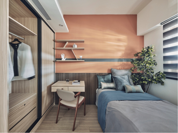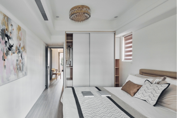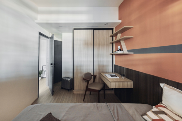緩步移動至臥房空間,其中一間延續客廳的金屬吊燈應用,並以些許香檳金、咖啡色作點綴。擺設的掛畫不僅呼應空間,亦為其增添一抹色彩。通往另一間以白色搭配淺木色的臥室,流淌一絲清新淡雅的氣息。最後一間臥房,採用棕橘色、灰色調搭配木質褐色,醞釀出內斂沉穩的氛圍,令居者感受舒適的靜謐時光。
