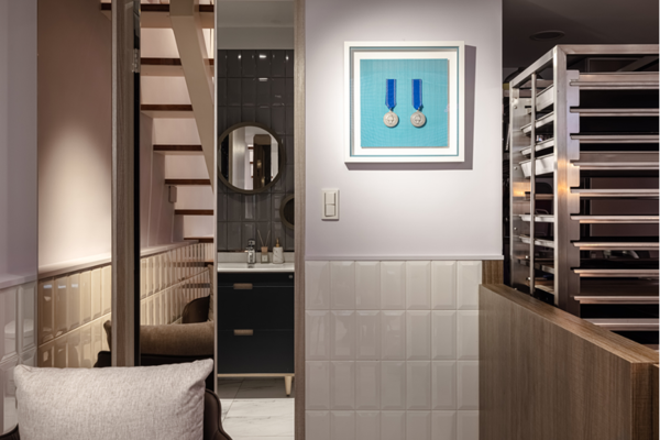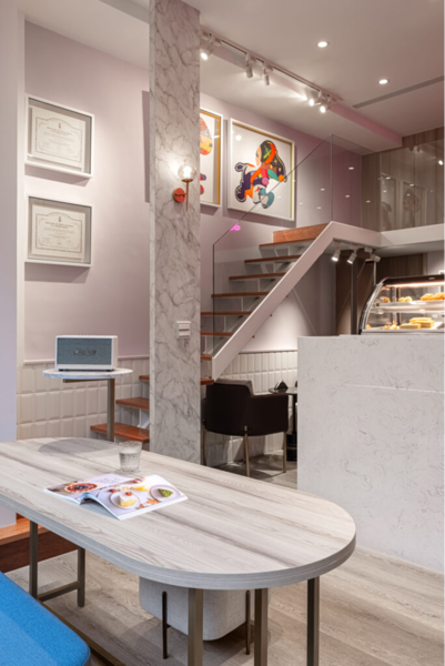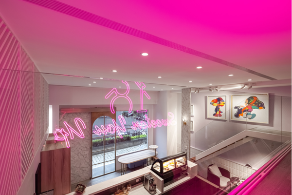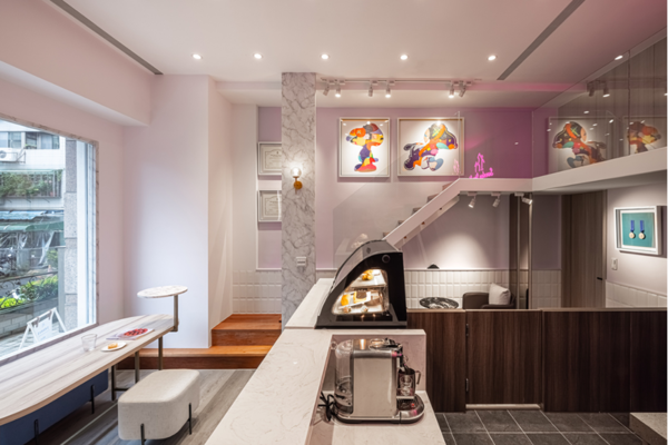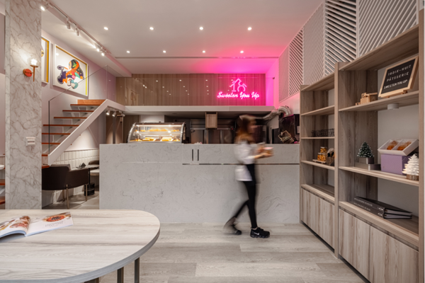 甜點帶給人們的感受不外乎便是夢幻與細膩,本案作為甜品店為了更加契合其品項風格的直觀印象,形拾室研曹登勝選擇運用色調與質地間的調和,在空間中塑造一如甜品般的氛圍。踏入店內可見北歐風四溢的木紋質地,首先營造出溫潤氛圍的同時,冷峻的淡灰白櫃檯與石紋柱體亦平衡了視覺的重量。一片片白磁磚和粉色漆、霓虹燈妝點著場域,有如甜品搭配般環環相扣,讓訪客在品嚐甜點的當下,也無不沈溺在甜而不膩的場域之間。視覺時刻牽動人們的情緒感官,本案以自身深刻印證了這點,出色的形象塑造除了成就品牌的發展,更勾勒了紐約設計大獎的銀獎讚揚。