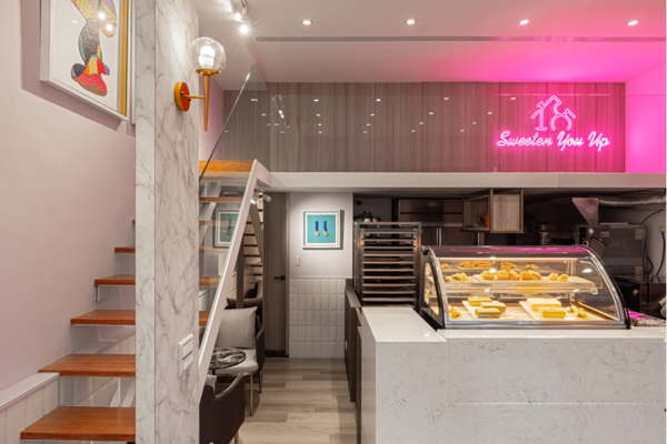 開一家屬於自己的甜品店,不單單關乎於製作甜點,對於其他的管理也需要付出較多的精力。門面的裝修風格,正好體現了一家甜點店的整體主題。設計師因此使用粗獷又豪邁的石頭漆於店面,黑石英磁磚與左側微微蜿蜒的白面牆做出清晰對比。室內以北歐風格的木質地板、淡灰白的基調為底色,牆面右上方的粉色霓虹燈,點亮了整體空間。