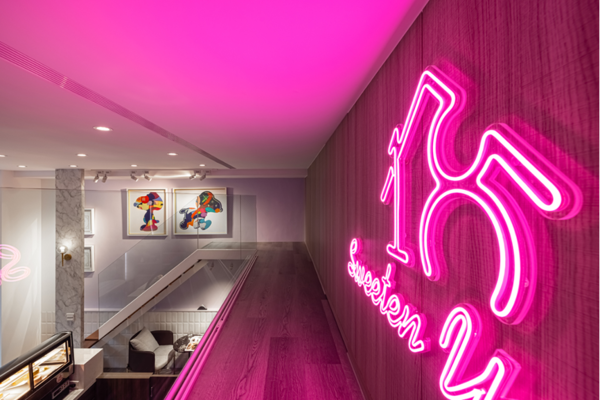 以自然視角設計櫃檯高度,微微傾斜的甜點展示櫃讓顧客可以輕易一覽、挑選甜品。窗前的座位區則讓人在欣賞風景之餘,可以細細品嚐甜點的滋味。樓梯下方的角落提供一隅隱私空間,以後方的鏡面延伸空間感。牆面上的兩幅畫,在相較明亮白淨的空間中,點綴一絲色彩。粉色霓虹燈透過玻璃與光線的反射下,層層交疊,創造不同角度的呼應,甜而不膩的氛圍色調,為壹拾捌甜點室打出最適切的品牌形象。