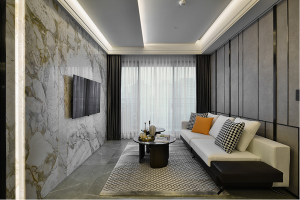 整體內部設計顛覆傳統思維,精巧地運用別樣的特殊材質相互結合,體現多元化的視覺感受,鑄就獨具匠心的美學格調。藉由大理石材獨特的紋理,使大自然的美感流淌於住宅中,令居住者體驗到源於自然界的壯闊。