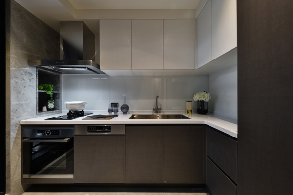 一踏進開放式的客餐廳,透過間接照明設置於天花板,營造出柔和舒適的空間氛圍。採用同色系的色彩配置,結合材質肌理的變化,創造截然不同的感官體驗。設計師巧妙運用灰色地磚、灰色特殊漆面牆、灰褐的木紋壁面等,相互交錯鋪述,添增視覺立體感與多元性。木質透出的溫度注入冰冷的載體,令空間塗抹一層溫潤、沈穩的氣氛,消弭石材產生的冷峻感。添置流線性燈光照明於餐桌上方,勾勒出現代簡約的奢華感。選用銀製、金屬等餐具物件,細細品味精緻格調的氣息。