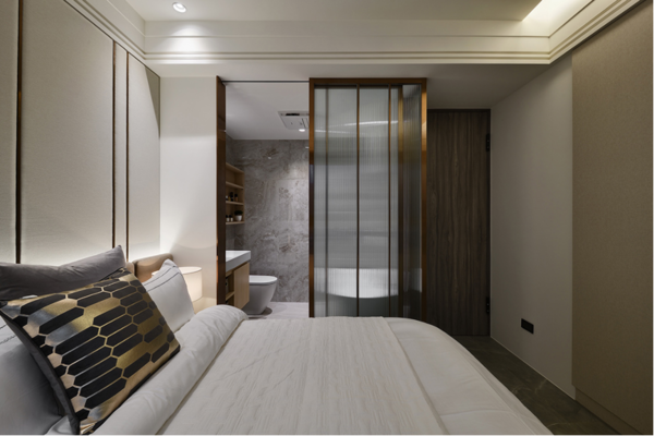 沿著灰色牆面結合黑金花紋的大理石端景,大理石紋的流體型態賦予廊道一股動態感,且使住宅每一隅蘊含細緻的輕奢美感。通往以淺色調為基底的主臥室,妝點幾分黑色調與金屬質地,塑造高貴典雅的氛圍。採用金屬框架結合長虹玻璃,作為區隔臥室與衛浴室的隔間門片,藉由視覺穿透感模糊空間的界定,令原先較狹窄的格局顯得寬敞通亮。走向衛浴室,以灰、白色調搭配褐色木質,透過簡潔俐落的配置佈局,營造簡約的風格美學。緩步移動至次臥室,採用灰、白、黑做為主色調,點綴些許綠色物件,跳脫出一絲趣味性。