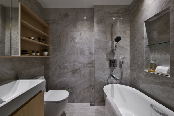 本案以特殊花紋的大理石材為空間主軸,搭配溫潤木質與灰色特殊漆面,相輔相成堆疊出層次感。採用附有金色花紋的大理石牆與桌檯,並以些許金屬物件作點綴,藉由細節營造內斂的奢華質感。