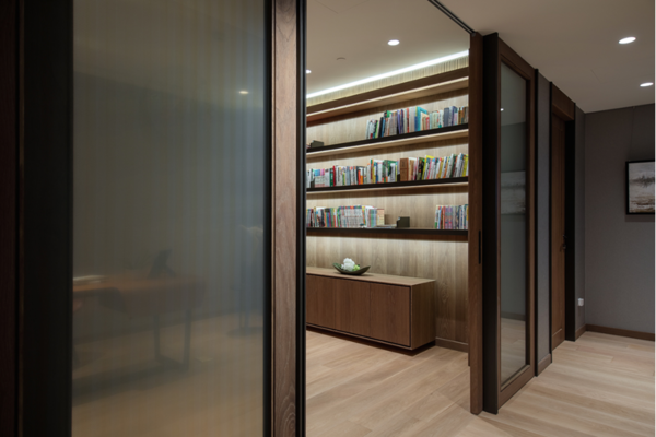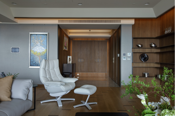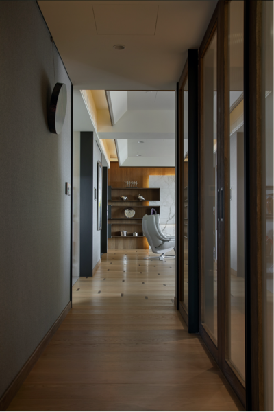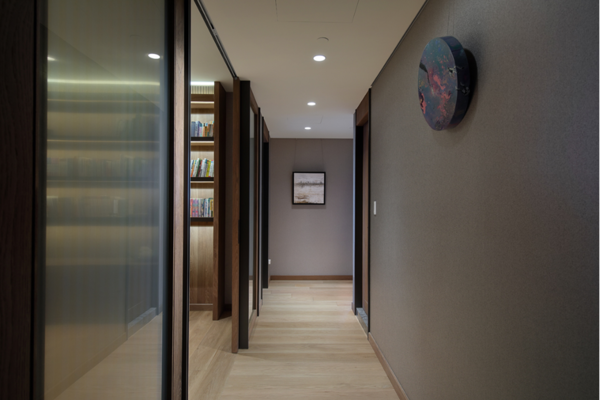 推開深褐色木質大門,映入眼簾的是日光從落地窗灑進屋中的景象,猶如求道的過程,打開心門、跨越心中的檻,從而迎向光明的未來。在每塊淺色木質地板拼的銜接處,各嵌入一深色木塊,恰似求道過程的層層心境,隨著逐步深入越加堅毅自身的心。整體由石與木的紋理鋪述而成,令人仿若身處天地自然間。於石牆上擺掛著畫家朱德群的作品-「瞻仰」,畫中色彩與如同潑墨山水畫的背牆,兩者共同譜寫出充滿律動的空間美感。擺設些許綠色植栽點綴其中,勾勒出優雅清新的氣息。