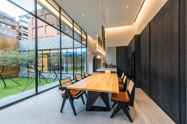 沿著石階而上,木格柵大門後面仿若有什麼力量引領人們一探究竟。進入室內,腳下的水磨石地板充斥著台灣老宅的復古情懷;挑高的天花延展了視線的高度,讓空間層次隨之提升。接待大廳以溫潤的木桌與暖橘色椅子歡迎賓客的到來;大面積的落地窗框住了室外的綠意,成為絕佳美景。