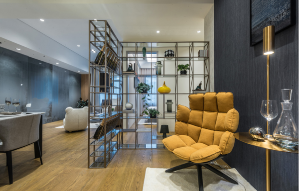 樣品屋展示了客廳、餐廳、浴室與臥室空間。客廳的大熊與小熊造型椅彼此相望,好似在聊著生活的趣事。餐廳、開放式廚房與品酩區豐富了用餐的層次,創造人們互動的機會。設計師利用金屬鐵件製成的收納架設置在品酩區四周,除了可以擺設酒、書籍與展示品外,也從餐廳中劃分了品酩區的空間。主臥室以寧靜的灰色與深棕色鋪陳,舒適的燈光照明與充足的衣櫃空間皆展現設計師對人們生活需求的精準拿捏。浴室白色大理石牆面讓衛浴空間增添一股清新氣質,黑色大理石具有避免地面顯髒的效果。設計師貼心地增加了曲線流暢優美的浴缸作為泡澡或孩童玩水之用。