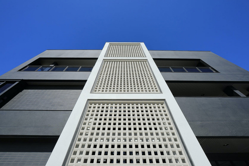 望向建築立面,外牆選用黑與白色陶砂骨材進行大面噴塗,並設計細膩的分割線條增添主體細膩度,再輔以黑灰色丁掛磚穿插其中,增添視覺層次感。除此之外,團隊運用專業工法將原建物外凸的弧形樓梯拆除後,打造整面白色花格磚牆,並將花格磚均分為三、垂直組構於四層樓高的建物中,使原先昏暗的室內空間引入大量光線。不僅創造通透且開闊的格局,亦讓建築立面更多變、有趣。其中,考量傳統空心磚無結構行為而存在的結構安全疑慮,因此特地選用由專業工匠手工窯燒製成的白色花格磚,並將花格磚四周採特殊工法進行車溝,讓鋼筋得以貫穿、搭接整座花格磚牆並延伸至結構樑、柱中。賦予挑高的牆體擁有獨立的結構行為,增添整體的穩固性及安全性,徹底排除傳統花格磚耐用度不高及載重過重的問題。