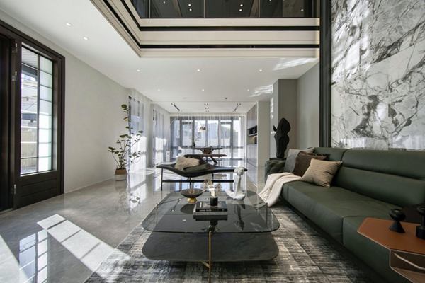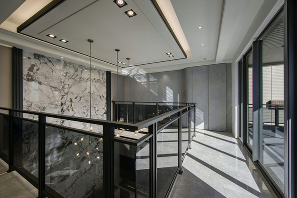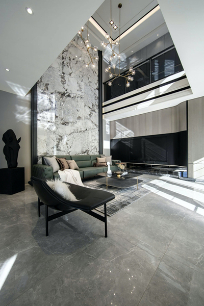 步入屋內,鑒於原先一、二樓間的實體樓板在台灣國家建築結構檢驗公司檢測後,發現竟已產生中性化反應,因此存有安全疑慮。而透過團隊巧妙構思及研討後,便將其樓板完全拆除,採用H型鋼骨新設整體架構,以挑空區迴廊的形式做呈現,打造出兩層樓高的獨立挑空空間,除了增添建案的獨特性外,更築構出寬敞明亮的舒適空間。沙發背牆選用厚實且適用大面切割、穩定度極高的石英岩類大理石材,將空間切成三大區,以混拚方式搭列出如雲彩般的幾何抽象。並採用乾式吊掛工法垂直排序,架設出六米高的主空間視覺牆面,巧妙延展空間視覺營造磅礡氣度。其中,從二樓天花垂掛而下的訂製吊燈,由團隊中多位設計師執筆手繪而成。燈具選用喻意高貴、忠誠的金黃色做為主色,搭配寓有圓滿、無限之意的圓型球燈,形塑出如世界地圖及金龍騰雲駕霧的意象。將球燈數量採用吉數「29」數,期望業主自家產業得以「如龍得雲,扶搖直上,智謀奮進,才略奏功」。