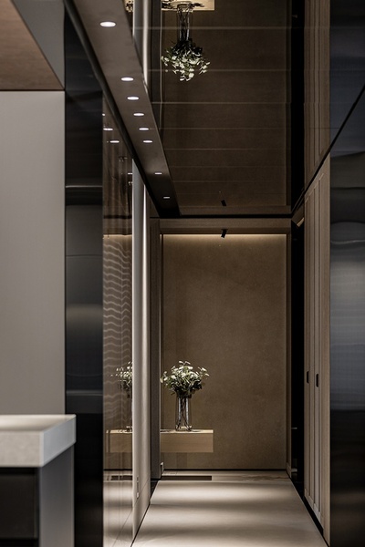 玄關與廊道是空間的迎賓序章,設計透過洗牆光線的柔和引導,輔以懸浮台座與綠意植栽的擺設,營造出靜謐且充滿儀式感的氛圍。鏡面天花進一步延伸視覺尺度,不僅擴展空間感,也將人的行走投射成一幅詩意倒影。整體節奏不張揚,卻蘊含深遠情感鋪陳,為訪客揭開生活場域的第一章。