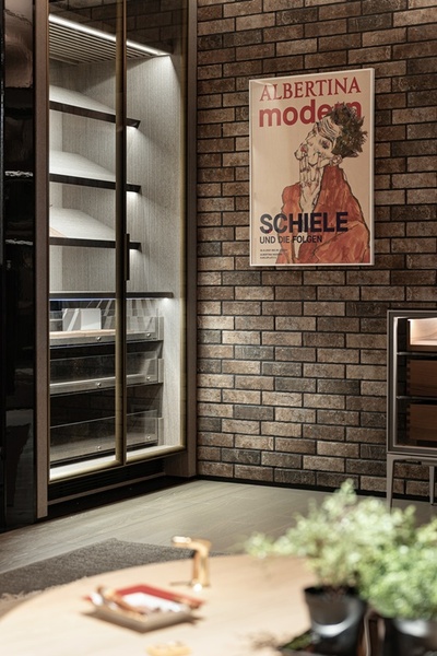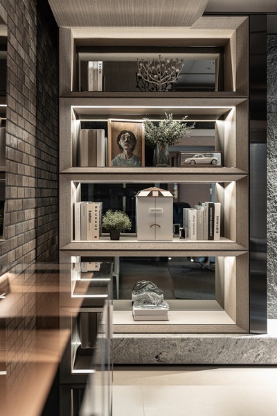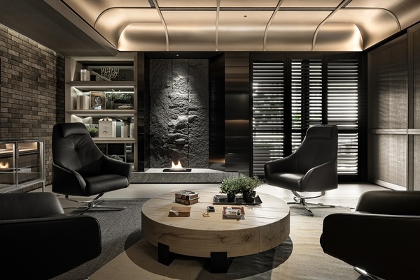 會客與閱讀區延續整體語彙,粗獷質樸的火山岩壁爐與冷冽俐落的金屬框構彼此碰撞,展現剛柔並濟的空間語境。皮革旋轉單椅環繞於空間中,如雕塑般佇立於場域核心,周圍層架收藏書籍與藝術品,流露當代紳士的精神與品味,讓此處成為兼具沈思與交流的精神居所。整體設計透過對材質、光線與動線的細緻整合,使空間不只回應使用者的機能需求,更引導身心沉澱,讓每一處轉場皆成為生活的柔光片段,實現設計與居住之間溫柔的交會。