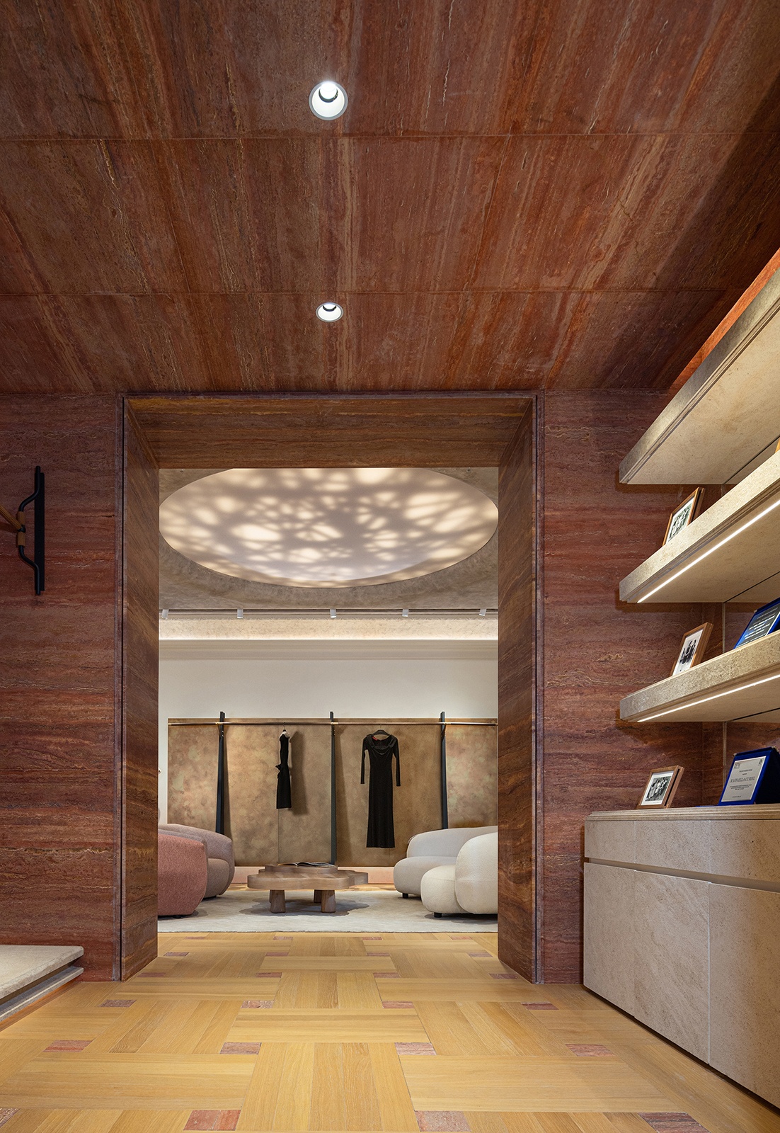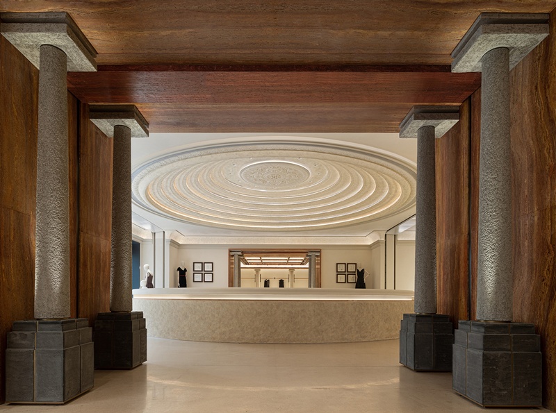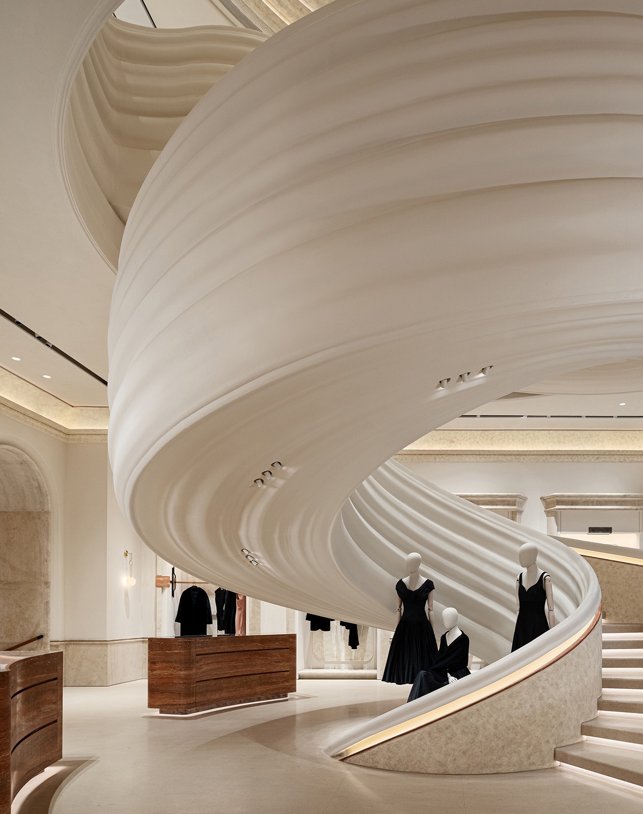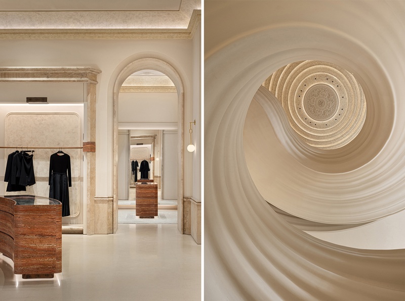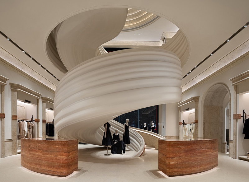 店內空間動線被拆解成一系列的連續場 景,旋梯、劇場式展陳區與生活沙龍等功 能區域,各自吟詠著歌劇的樂章。中央螺 旋樓梯以漸開線盤旋攀升,其層疊曲面經 參數化建模精確掌控,在漫射光中呈現出 絹紗裙裾般的輕盈美感。動態雕塑的未來 感與石材的沈穩靜謐相互碰撞,展開了新 舊、傳統與創新的辯證對話。