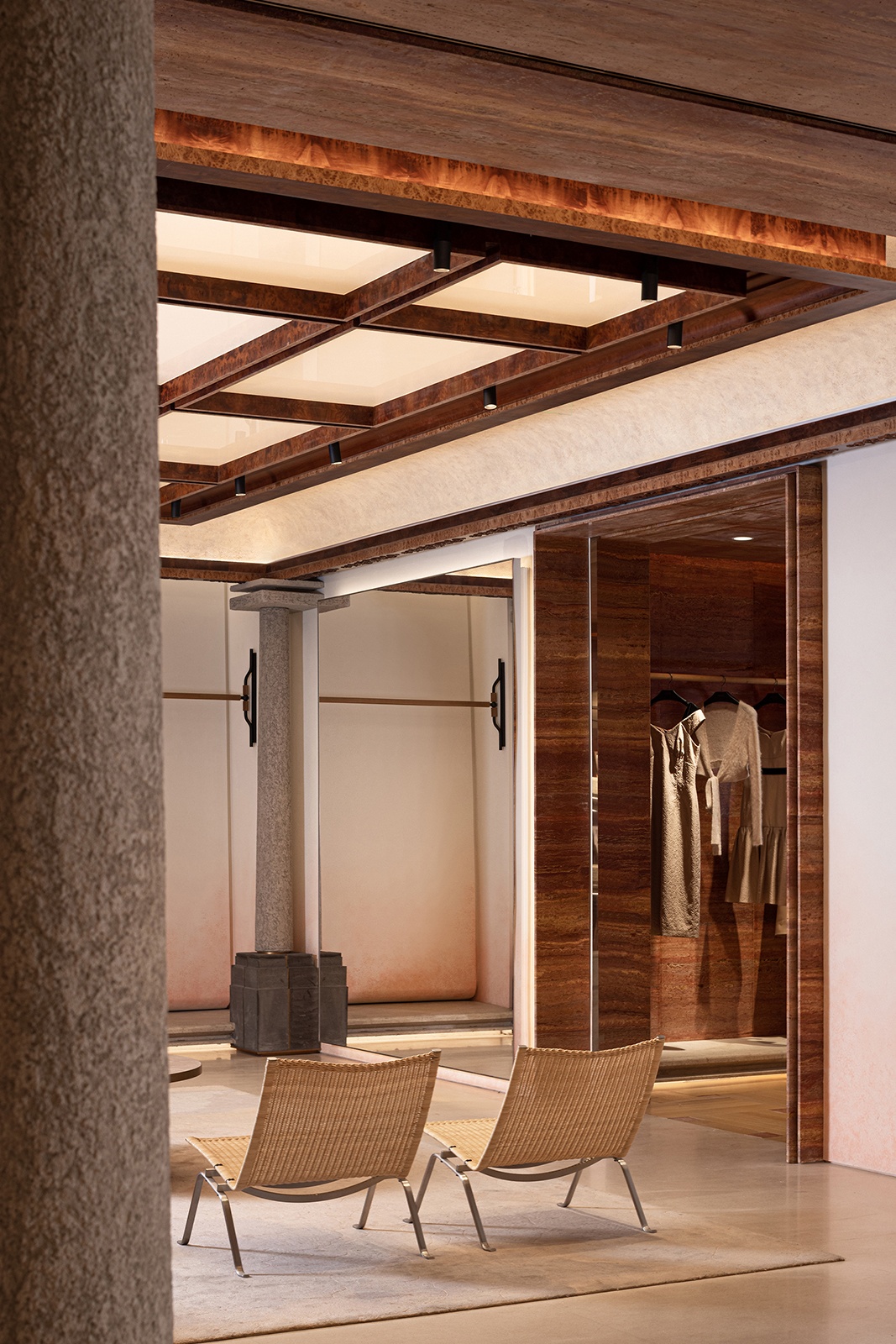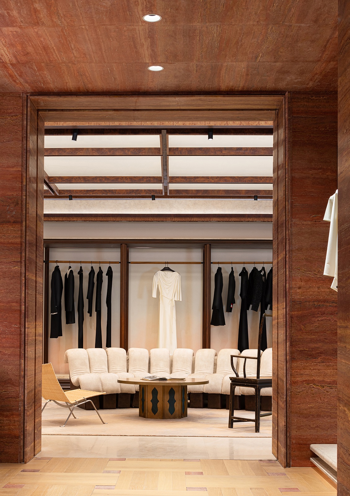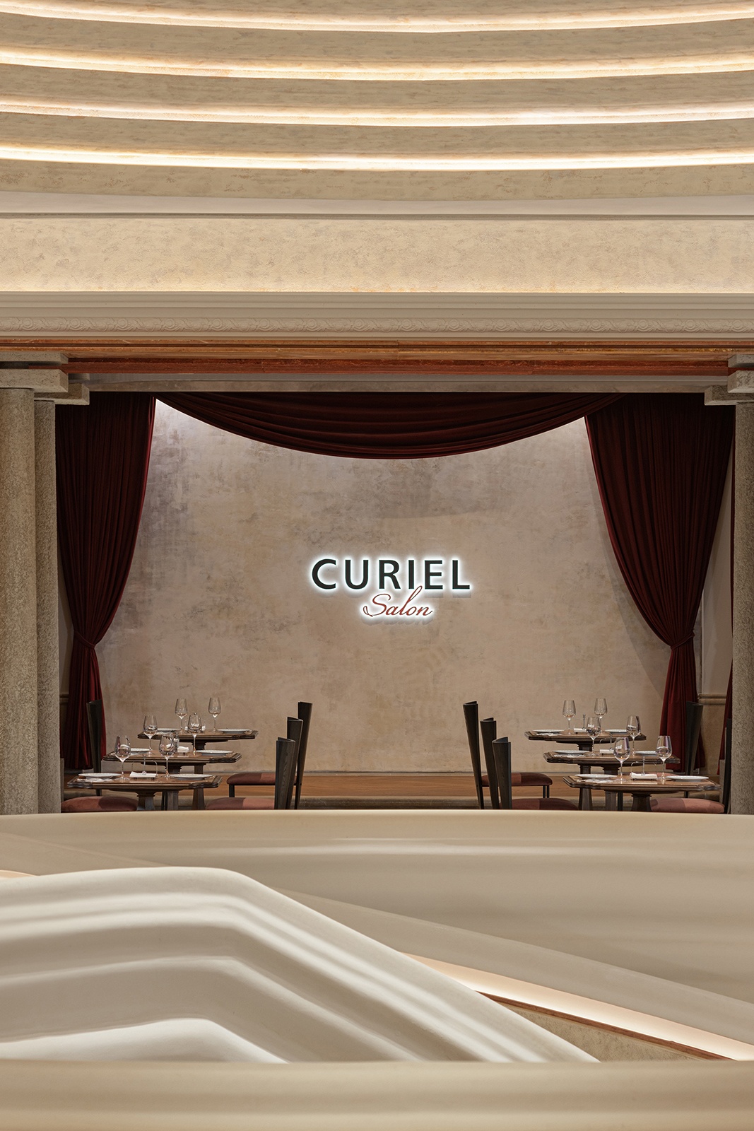 CURIEL CASA 旗艦店並非只是品牌的展示據點,更是一場跨文化語境下的空 間實踐。設計團隊以歌劇結構為引,揉合東方工藝與當代建築語彙,重新詮釋品 牌核心價值,將優雅與張力並置,讓空間本身成為敘事的舞台。而這套設計語法 超越了風格表層,精準融合品牌識別與文化脈絡,強化了 CURIEL 在全新市場 中的文化辨識度與精神厚度。承載的不只是歷史的延續,更是品牌精神與地域文 化之間的深度交織。在紅色帷幕背後,一場跨越世紀的詩意詠嘆仍在悄然上演。