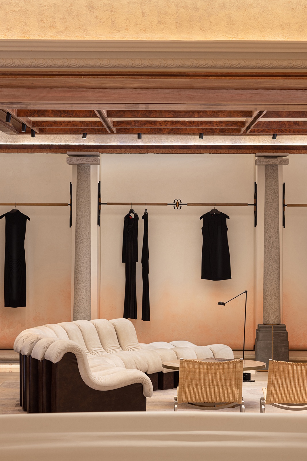 CURIEL CASA 旗艦店的設計理念,將品 牌百年歷史與歌劇敘事結構融為一體。建 築被視為一個說故事的載體,以歌劇的「開 端、上升、高潮」三幕式結構,引導訪客 展開層次豐富的體驗。從開場的紅色幕布, 走入曲線樓梯主導的升調樂章,最後抵達 象徵高潮的舞台核心 CURIEL SALON ,整 體動線如同一齣「空間歌劇」,層層推進, 節奏遞進。