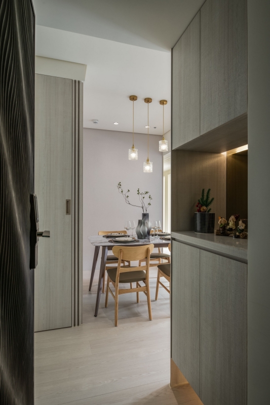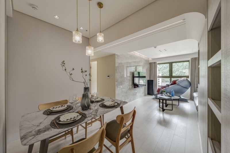 - 大器迎賓:入門即見餐桌,搭配三盞輕奢吊燈形成端景,勾勒簡約視覺。