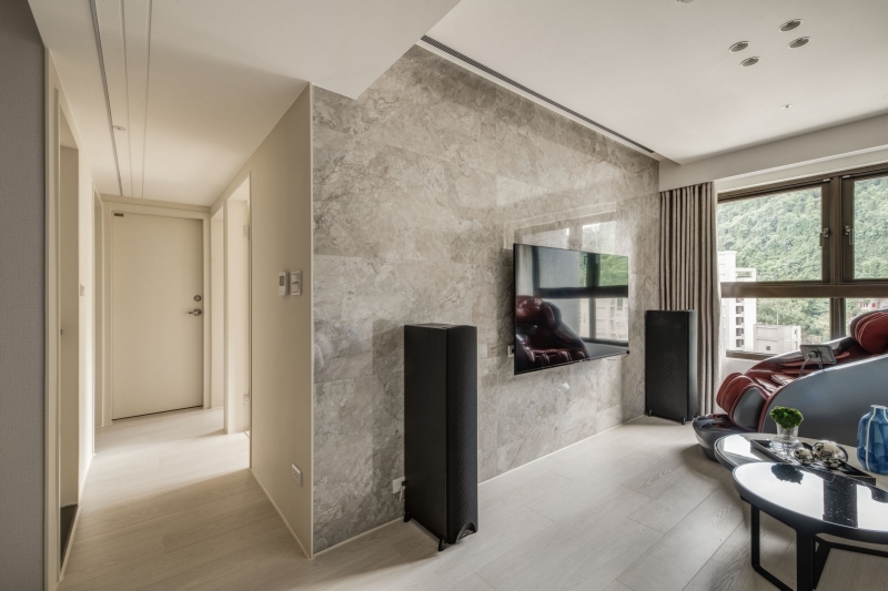 - 客廳主牆:暖色大理石電視牆呼應外部山景,形塑溫潤氛圍。