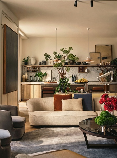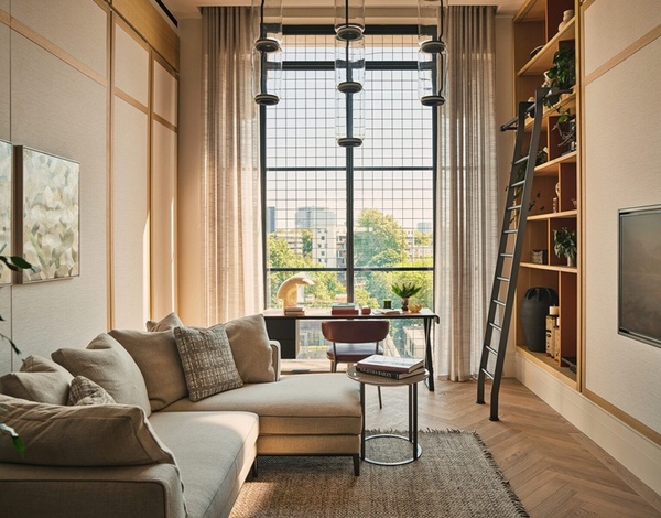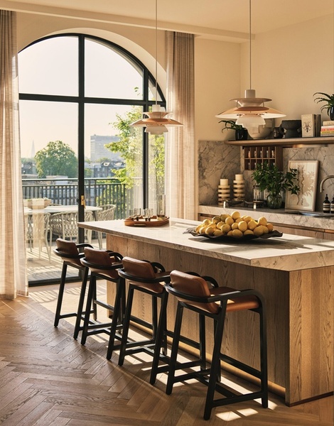 米色沙發與溫潤木質構築柔和基調,承載一日之間的光影與生活變化。落地窗框起倫敦街景,四季更迭宛如背景長卷,於客廳與書房間鋪展。黑橡木書櫃矗立一側,搭配移動梯,彷彿隨時能開啟思緒遠行。廚房以中島為核心,石英岩檯面映照晨光與夜色,搭配皮革高腳椅,成為日常對話的柔和落點。拱形臨窗柔化室內與戶外邊界,露台的綠意與陽光自然滲入,使生活場景在開放與私密之間靈活切換。