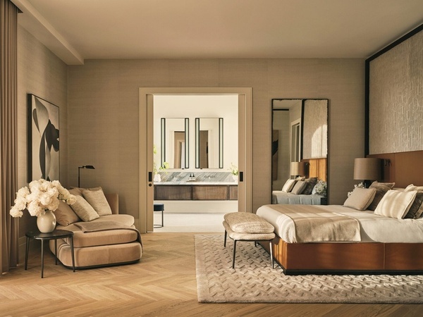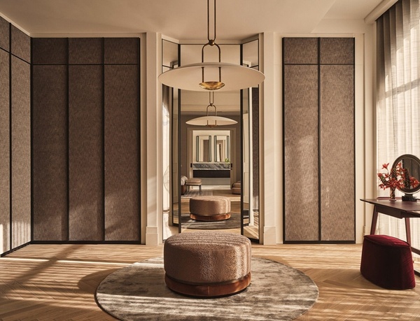 清晨的光線透過拱形玻璃緩緩滲入,沿著木質地坪延展,為空間輕覆一層溫潤的金色紋理。皮革、石材與金屬交織其中,淺色牆面則映照出細膩的明暗層次。序章緩緩展開,將人們從地標建築的壯闊外觀,引領進入一場由光影與質材共同編織的旅程。