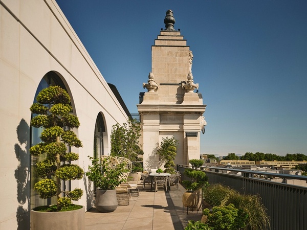 88平方公尺的私人露台宛若與城市對話的高台,層疊綠植在視線中輕柔鋪敘,既營造私密的避風港,也讓遠景的天際線徐徐展開。石材餐桌與藤編座椅隨風吹拂,遠處圓頂與屋簷線條勾勒出城市的輪廓。致使每一次佇足,皆是與喧囂的離別,讓心緒在穹頂之下緩慢沉澱。