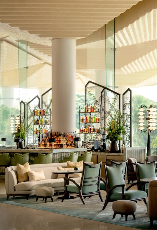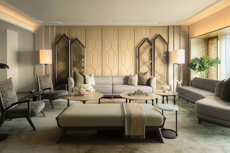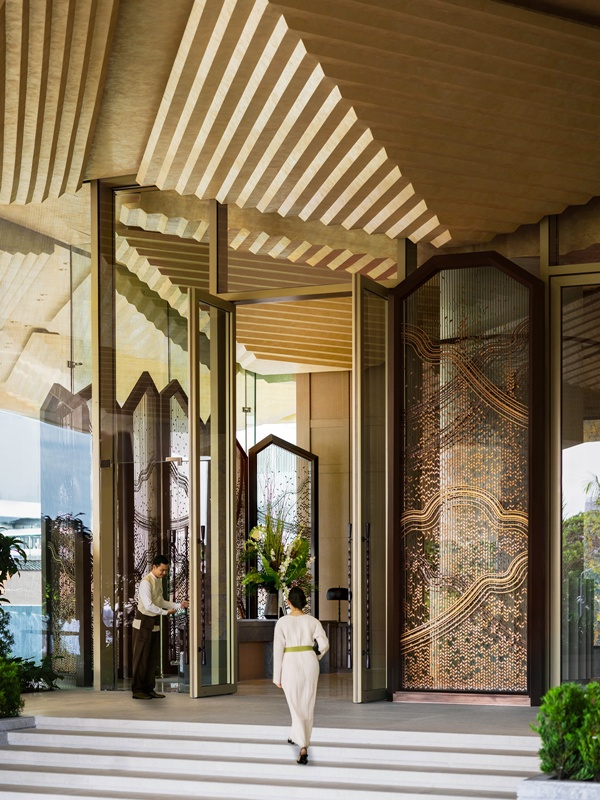 酒店設計由André Fu 領銜團隊擘劃,以細膩情感和比例秩序構築。光線沿結構蔓延,柔亮光暈輕撫石面與金屬,映現出城市氣息與旅人心境的變化,使晨曦於建築肌理間輕柔漫行。