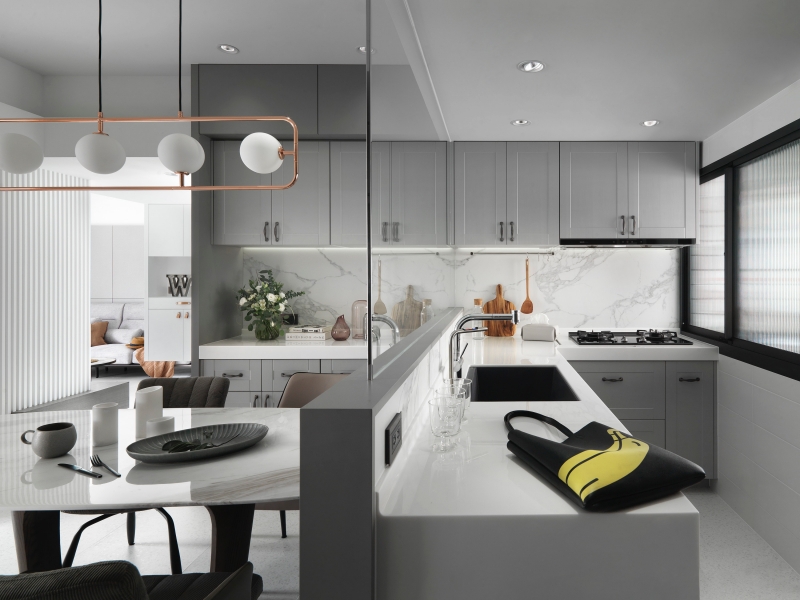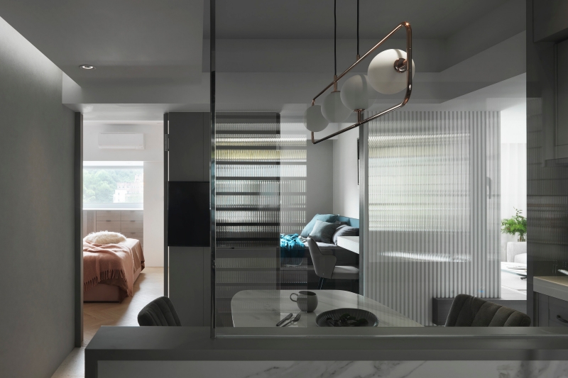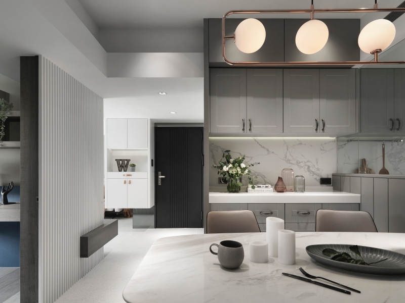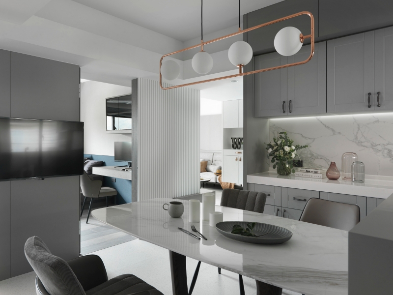 公領域以通透的界線重構餐廳、廚房與客廳之間的關係。半高牆結合極簡玻璃隔斷,讓視線與光線得以連續推進,並回應油煙阻隔的實際需求。霧灰色系櫥櫃與白色大理石紋牆面構成冷靜背景,搭配金屬框件與玫瑰金幾何吊燈,形成明確的視覺錨點;間接照明與櫃體洗牆光的層次配置,使整體光環境更趨近飯店公共空間的細膩質感。