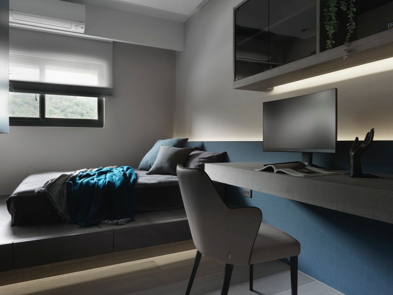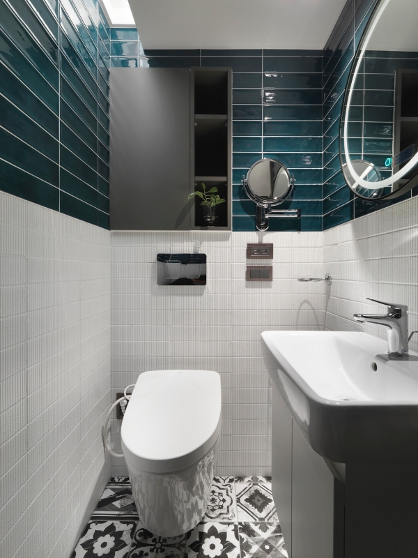 私領域則以色彩作為情緒敘事的轉換。主臥透過乾燥玫瑰粉軟包、人字拼木地板與柔光照明,營造包覆而安定的休憩氛圍;次臥以藍綠色調、鐵件元素與架高地坪整合收納機能,展現理性且率性的空間性格。衛浴空間大膽運用水磨石、復古花磚與孔雀藍地鐵磚進行異材質拼接,使日常沐浴行為轉化為具有儀式感的體驗。
