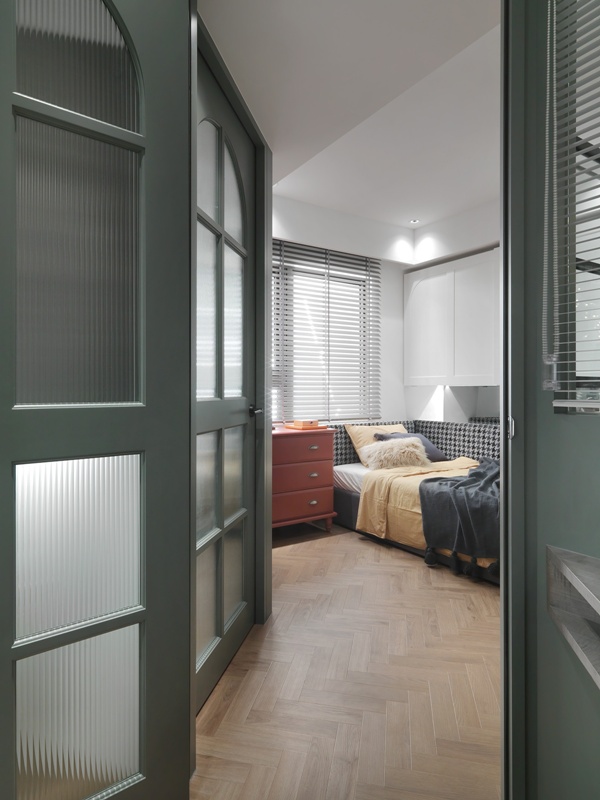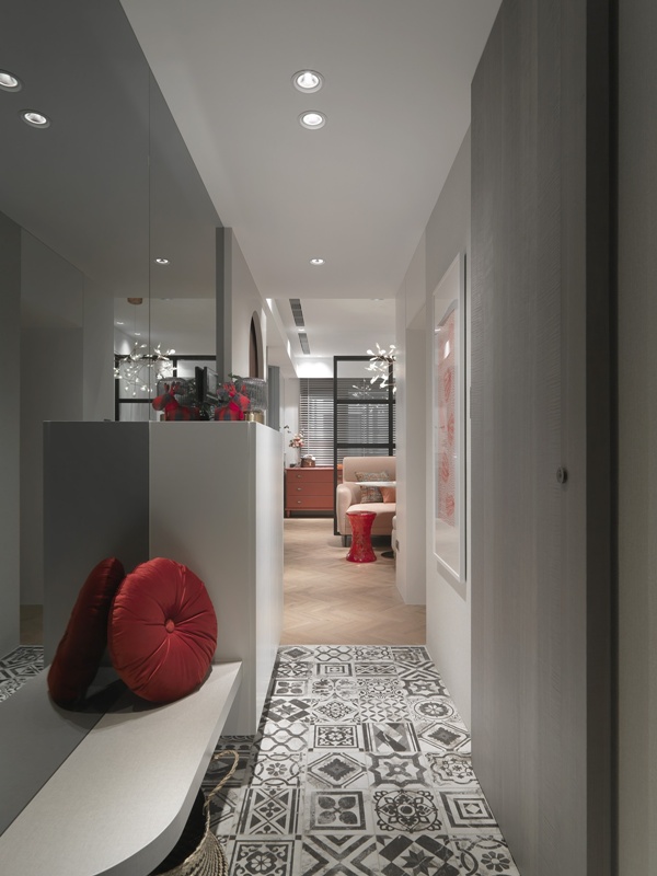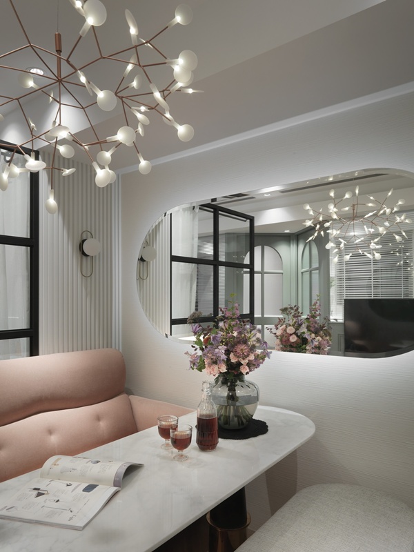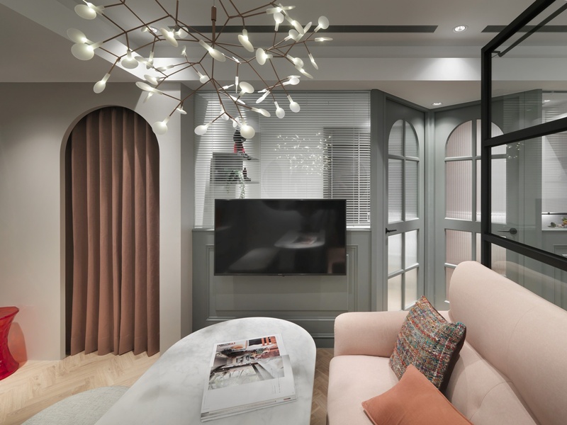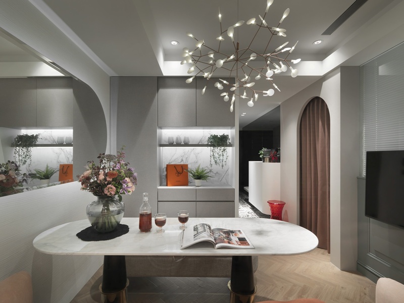 私領域過道導入墨綠色拱門語彙,柔化原有結構線條,為動線轉換注入古典節奏。臥室空間依需求分別鋪陳粉色、灰綠與中性色調,透過材質、色彩深淺與家具比例的差異,形塑各自性格,卻仍維持整體的一致性。全屋在白金灰階的中性基調中,以色彩軟件為節點、以精緻材質為細節,層層堆疊空間表情。珊瑚粉絲絨、勃艮第紅與復古墨綠分布其間,注入飽和張力;銀狐白大理石、鍍鈦金屬與枝狀吊燈則以克制手法點綴,使空間隨光影呈現多重表情。
