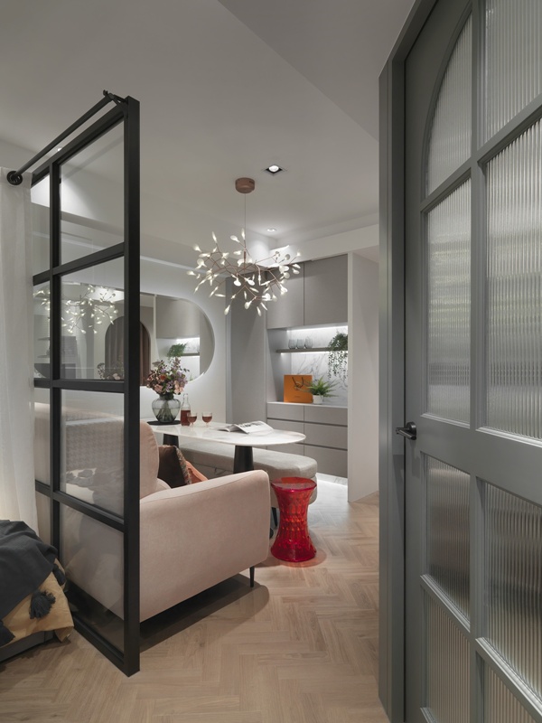 空間規劃以「穿透與界定」作為核心策略。玄關以黑白幾何花磚界定落塵區,並結合鏡面立面放大縱深,建立清楚的空間轉場。公領域捨棄實牆分隔,改以黑色鐵件與長虹玻璃形成半穿透介面,讓視線與光線在空間中自由流動,同時保有場域界線。人字拼木地板作為基底,建立連續而開放的生活核心。